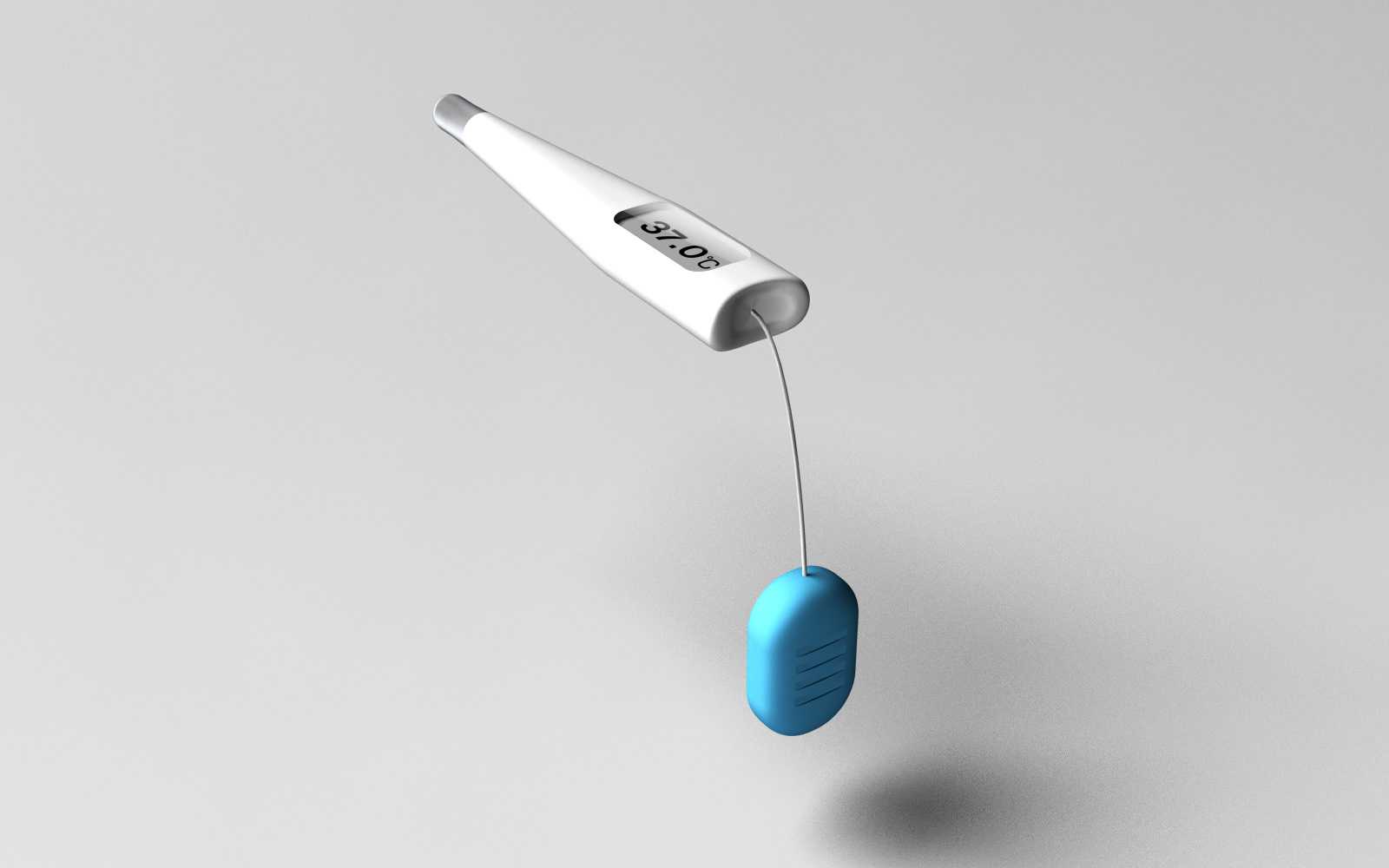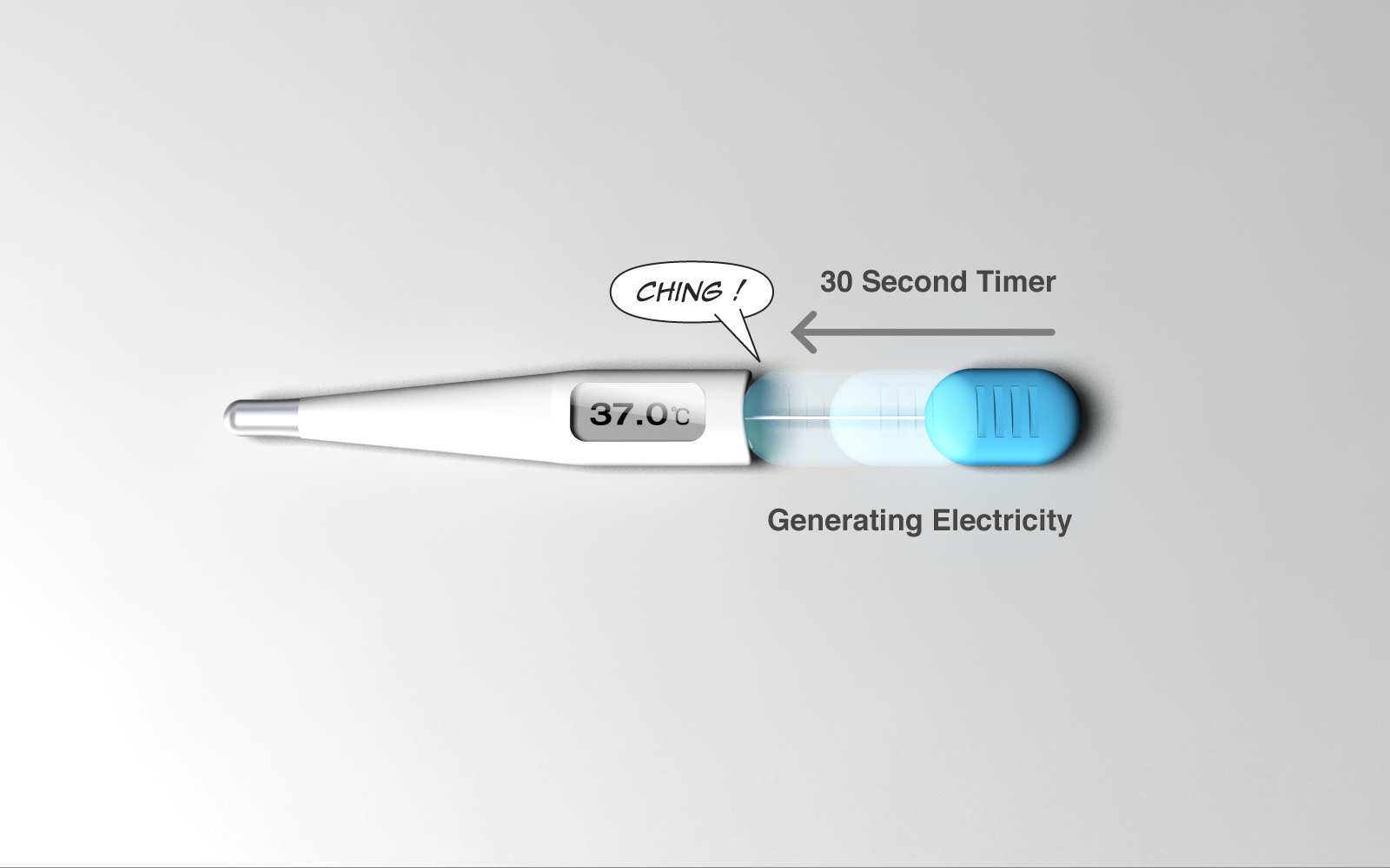 A body temperature thermometer for short tempered people. You know, body thermometer these days can finish taking temperatures much shorter than before, but you wait for some time and you never know how much more you have to wait. So you just pull this blue tag and see how much longer you have to wait. It also generates electricity for itself.